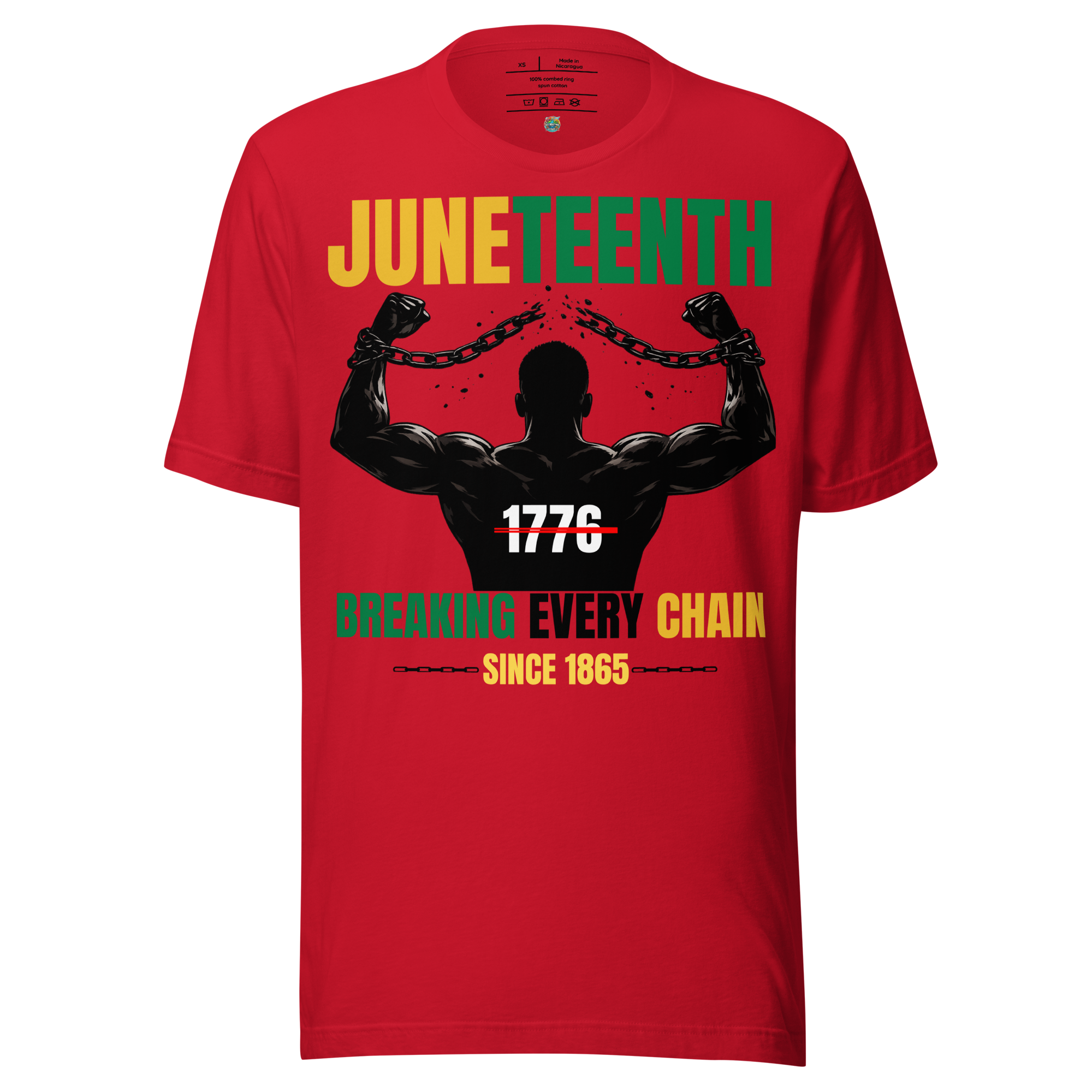 Featuring a bold silhouette breaking chains, this piece represents strength, resilience, and the ongoing journey toward liberation. The red, black, and green color story pays homage to heritage, unity, and power—making this shirt both meaningful and wearable.